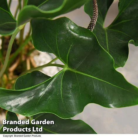 Anthurium โArrowโ is a handsome houseplant with distinctive arrow-shaped, deep green glossy leaves held on the tips of long, elegant stalks that arise from a nest of tangled roots. Height: 1m (39in). Spread: 50cm (20in).