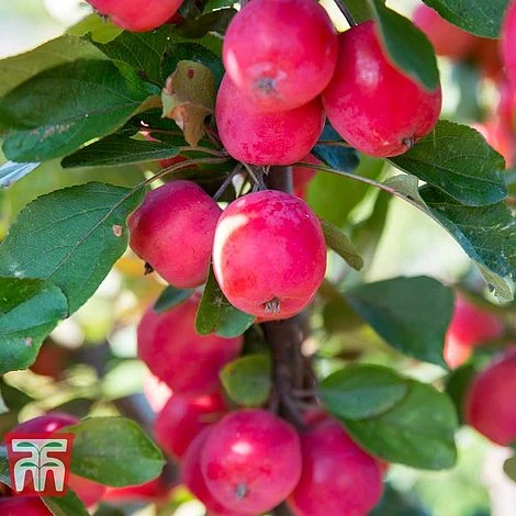 Everything about this tree is in miniature โ except the size of the crop! Apple โAppeltiniโ is a compact new variety reaching just 2m tall with maturity, making it perfect for a large pot on the patio! Its pretty pink blossom makes an attractive feature in spring, followed by a plentiful crop of tiny, golf-ball sized apples. The fruits have purple skins that ripen to glossy, rosy red with a lovely sweet flavour. These bite-sized fruits have plenty of appeal for kidsโ lunch boxes and make excellent toffee apples too. Fruits can be harvested from August to November. Height and spread: 2m (6′).