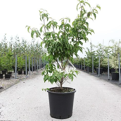 Cornus kousa โRoberts Selectโ is a compact selection, making this small multi-stemmed tree or shrub even more suited to smaller spaces. The large, showy flowers of โRobert Selectโ have twisted sepals, adding to their elegance. In May and June, tiers of horizontal branches are decked with masses of luminous white bracts, against a dense canopy of glossy green leaves. Strawberry-like fruits provide additional interest before a flamboyant finale of purple-crimson autumn foliage colour. One of the best trees for small gardens, providing plenty of interest throughout the seasons. Height and spread: 2.5m (8ft).