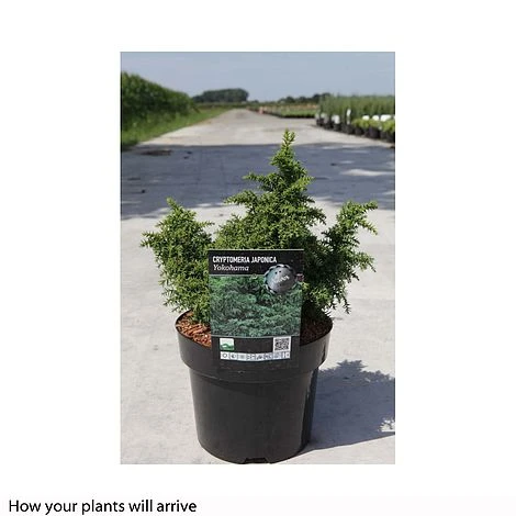 Forming a bun shaped mound of dense green foliage, Cryptomeria japonica ‘Yokohama’ is ideal for containers, rockeries and borders alike. Easy to maintain – requiring no pruning at all – this dwarf conifer will turn to a darker green almost bronze colour over the winter months and will then return to its green in the spring. Height: 100cm (39″). Spread: 100cm (39″).