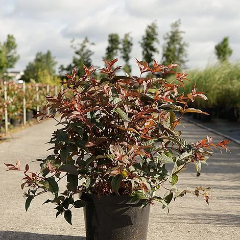 This award-winning Diervilla sports handsome burgundy foliage throughout the season with clusters of contrasting sulphur-yellow, tubular flowers in summer. In autumn, the foliage colour intensifies to bright red and orange before falling. Diervilla splendens โDivaโ is a tough and reliable deciduous shrub that is especially useful in partially shaded borders and difficult soils. It requires virtually no maintenance and is drought tolerant once established, adapting to almost any situation. Diervilla ‘Diva’ spreads by suckers, quickly forming a bushy mound clothed in lance-shaped leaves. It makes a useful shrub for a mixed border where its chocolate foliage creates depth and provides a welcome change from the usual greens. It can also be used as a low hedge, as ground cover in massed plantings, or as a container specimen. The foliage makes an excellent filler for cut flower arrangements. Height and spread: 1.2m (4ft).