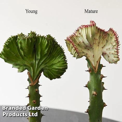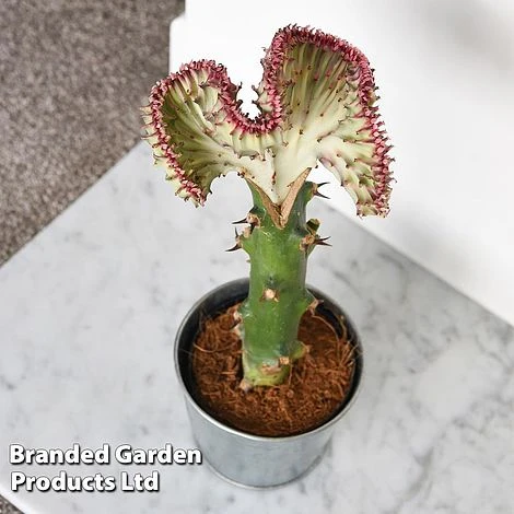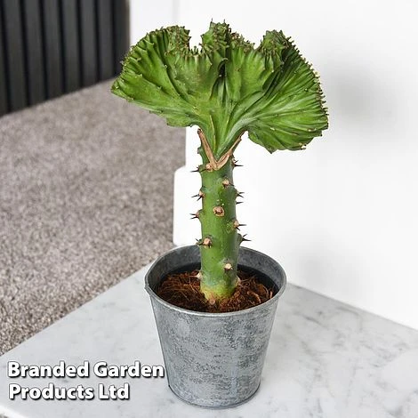 Accent your home with this unusual house plant. Also known as Coral Cactus, this spiny-looking Euphorbia lactea ‘Cristata’ is a low maintenance tender variety which makes a contemporary and easy living feature in the home. The stems are irregular, many of which develop a curved fan shape similar to sea coral. The stems have white marbling and are edged with a contrasting reddish hue which really highlights their unusual, varied shapes. This variety will appreciate a position in your home which received plenty of sunlight. Its undemanding, drought tolerant nature means you only have to water it very occasionally when the soil is completely dry. Height: 35cm (14โ). Spread: 15cm (6โ).
