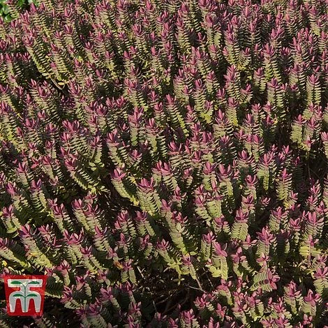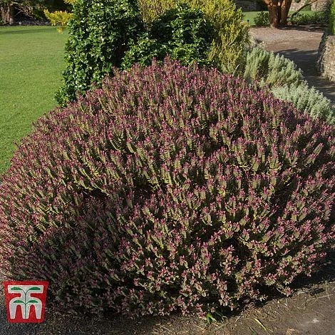 Selected from Hebe ‘Red Edge’ parentage, this hardy evergreen shrub is virtually identical, but with much improved colouring to its winter foliage. New shoots emerge purple-red and gradually mature to grey-green with red margins. As autumn progresses the entire plant turns a rich, wine-red colour that will light up borders and containers through the coldest months. Although primarily grown for its foliage, the lilac-blue summer flowers certainly add to its appeal. With a compact, rounded habit, this neat little hardy shrub is undemanding and low maintenance. Perfect for growing in containers, rockeries, at the front of sunny borders, or as a low evergreen hedge. Height and spread: 60cm (24″).