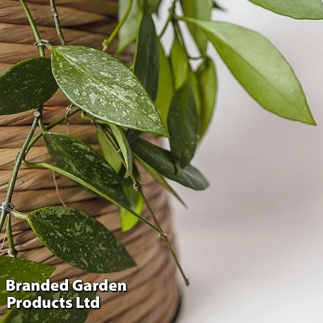 A great hanging houseplant, Hoya gracilis makes a calming and exotic addition to a bright room such as a kitchen or bathroom. Slender tumbling stems bear opposite pairs of pointed, attractively speckled leaves. Given enough light, clusters of sweetly scented pink flowers will also be produced. Height: 120cm (47in). Spread: 100cm (39in).