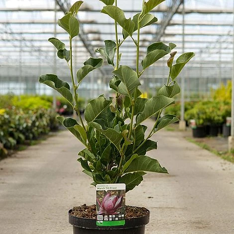 If you love magnolias but wish they didnโt have such as short season, this is the perfect variety for you. Magnolia โMarch Till Frostโ fulfils its name, delivering masses of blooms in March/April and then continuously producing sporadic bursts of flowers until the first autumn frosts. A liliflora type, the upright flowers donโt open completely, forming elegant, tulip-shaped blooms that change colour as the season progresses. The first flowers are pale pink, the later ones deepening in colour to carmine. The inner colour of the tepals is rose-pink to white, forming a striking contrast with the darker exterior. The flowers are followed by erect, candle-like, magenta seed pods that contrast beautifully with the foliage, adding a second season of interest. Magnolia โMarch Till Frostโ forms a small, upright, well-branching tree with glossy, dark green leaves. It makes a stunning deciduous shrub or tree for a small to medium garden. Height and spread: 2- 5m (6.5-16ft).
