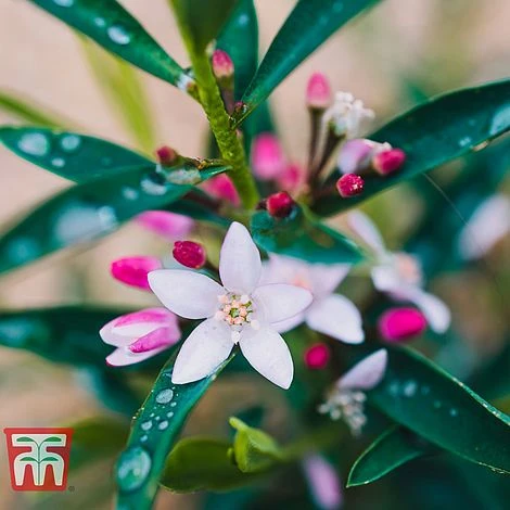 Both the blooms and the foliage of Eriostemon myoporoides have a fresh, zesty fragrance which could easily be described as gin and tonic scented! This half hardy shrub blooms in winter and spring with delicate star-shaped flowers above a bushy mound of linear evergreen foliage. Also known as wax flower, itโs long been a favourite spring stem with florists for its long-lasting blooms and heady fragrance. This shrub can be kept compact, as it not fully hardy itโs a great addition to a conservatory where it will provide winter interest. You can also grow it outdoors throughout the year, as long as it is in a sheltered location where it will not be subject to frost or harsh conditions. Height: 2m (6โ). Spread: 2m (6โ).