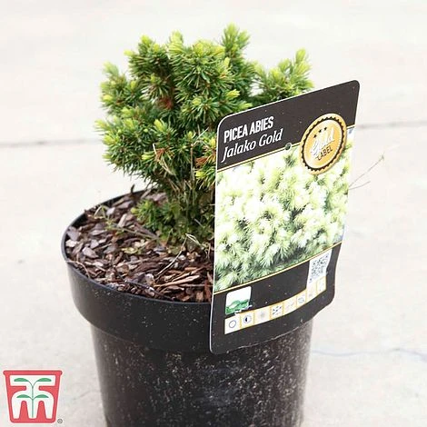 Picea ‘Jalako Gold’ is a visually stunning, fully hardy, dwarf conifer. With a compact, rounded habit, it forms a dense mound of green needles with paler golden tips that create an attractive contrast. Picea glauca ‘Jalako Gold’ makes a fine specimen plant, singly or planted as part of a grouping in a rockery, border or even planted into a patio container. Perfect for adding texture and year round colour to the garden. Height and spread: 40cm (16″).