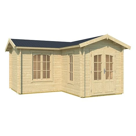 A rather unique L Shaped building especially designed as a corner building. As per the images the building can be “handed” such that it is suitable for either corner of the garden. Featuring 44mm wall logs and superb quality tilt and turn double glazed windows, The Norland Portland is an ideal building for use 12 months of the year. The cabin is in one roof and includes a double door, a single window and a double window. In common with most Norland Log Cabins, this cabin includes the floor. The cabin is a straightforward self assembly proposition for anyone with basic tools and DIY aptitude.