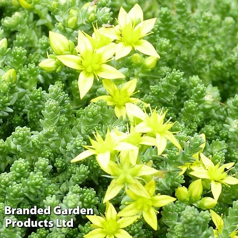 Sedum acre is a low-growing hardy succulent forming a mat of tiny fleshy green leaves, which becomes blanketed in bright clusters of yellow star-shaped flowers in summer. Thriving in dry sunny spots and poor, thin soils, this drought-tolerant British native requires virtually no maintenance and is ideal for dry ground cover, green roofs, rockeries, coastal gardens and planting into walls. The flowers are attractive to bees and other insects. Height: 5-10cm (2-4ins). Spread: 30-60cm (12-24in).