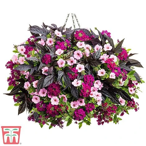Collection contains: Ipomoea โSweet Caroline Purpleโ, Verbena Vepita โDark Magentaโ and Petunia โVista Bubblegumโ. Height: 25cm (10″). Spread: 45cm (18″).