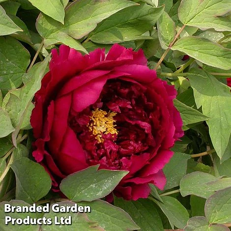 Tree Peony ‘Wu Jin Yao Hui’ roughly translates from the Chinese as ‘Glittering Black Gold’. In late spring and early summer, it produces an abundant display of large, deeply cupped blooms, composed of densely-packed, silky petals in a glossy burgundy/maroon with purple blotches at the base, highlighted by a central boss of golden stamens. The blooms are delicately fragrant. Height and spread: 150cm (5’).
