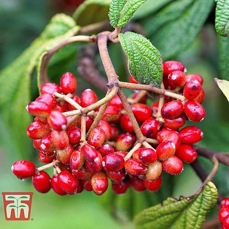 This impressive, hardy Viburnum is one of the larger species which will quickly make an impact in the garden. The dark, evergreen foliage is prominently veined and felted grey beneath โ a lovely backdrop for the clusters of white flowers in spring. Female plants may produce small red berries if the flowers are pollinated, which ripen to glossy black. Viburnum rhytidophyllum is a handsome, large shrub which makes a superb screening plant or hedge in larger gardens. When planted in mixed borders and woodland gardens, it will provide valuable year-round structure and colour. Height: 4m (13′). Spread: 5m (16′).