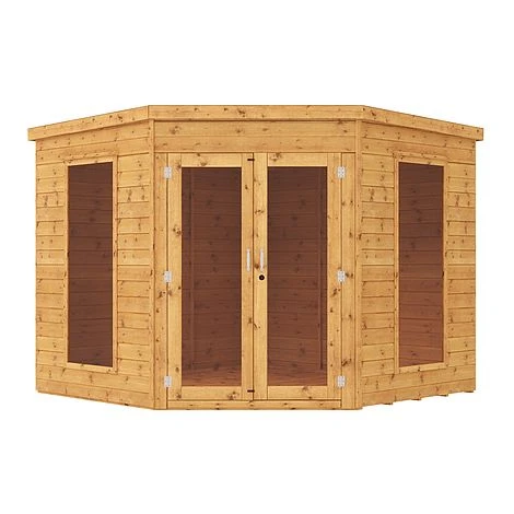 Whether youโre looking for a craft room, entertaining space or somewhere to relax at the end of the day, the Waltons 8 x 8 Premier Corner Summerhouse could be the perfect fit! This wooden summerhouse is designed to maximise your space by sitting perfectly in the corner of your garden, while giving you wonderful panoramic views. The two fixed windows and fully glazed French doors, all glazed with shatterproof styrene, create a bright and welcoming interior.