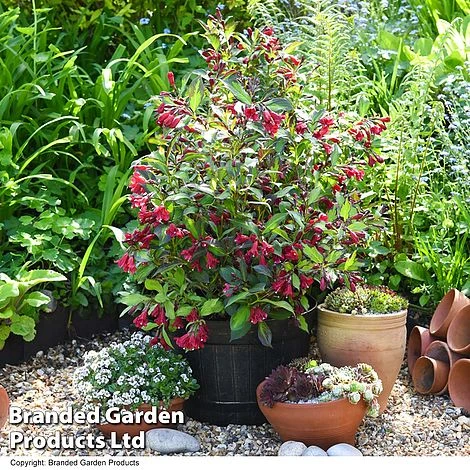 A stunning new Weigela launched at Chelsea Plant of Year 2023, โCamouflageโ is the first to pair deep red flowers with variegated green/purple foliage. Generous clusters of trumpet-like, ruby-red flowers are set against foliage splashed bright green with purple-bronze margins. The whole effect is vibrant but harmonious, the flowers toning beautifully with the purple tints, whilst the lime splashes create contrasting highlights. Compact and densely branching, Weigela โCamouflageโ is a reliable and rewarding shrub for mixed borders and containers in sun or partial shade, providing a long season of foliage interest as well as colourful flowers. Height and spread: 60cm (24in).